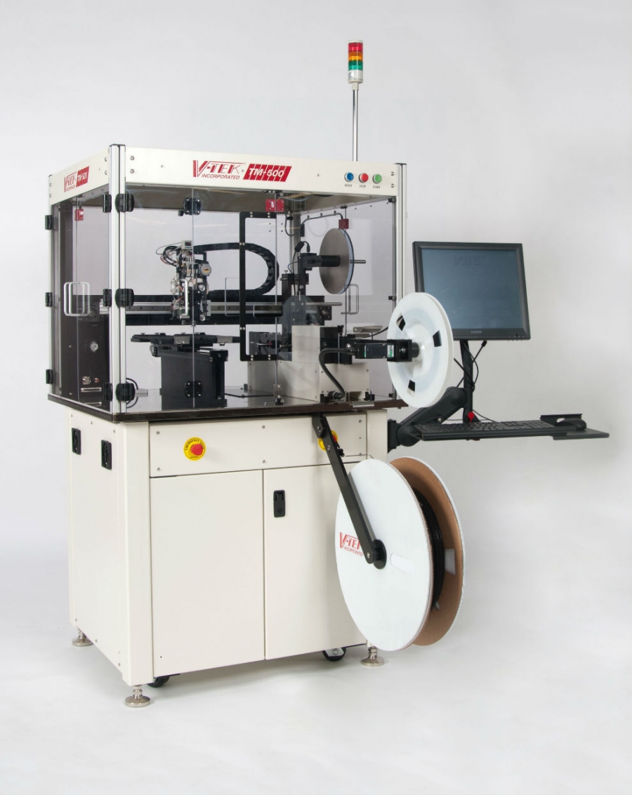 The TM 500 is a multiple input pick and place test, inspection and taping machine designed for high mix/low volume production environments for electronic devices.